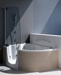 Corner tub and shower combo. Corner tub shower combo ideas, walk in tub shower combo ,tub to shower. Small corner tub and shower combo with glass wall panel. This unusual corner whirlpool shower combo by teuco offers cool and contemporary comfort without compromise, banishing the boring and unsightly baths of the past into distant memory.