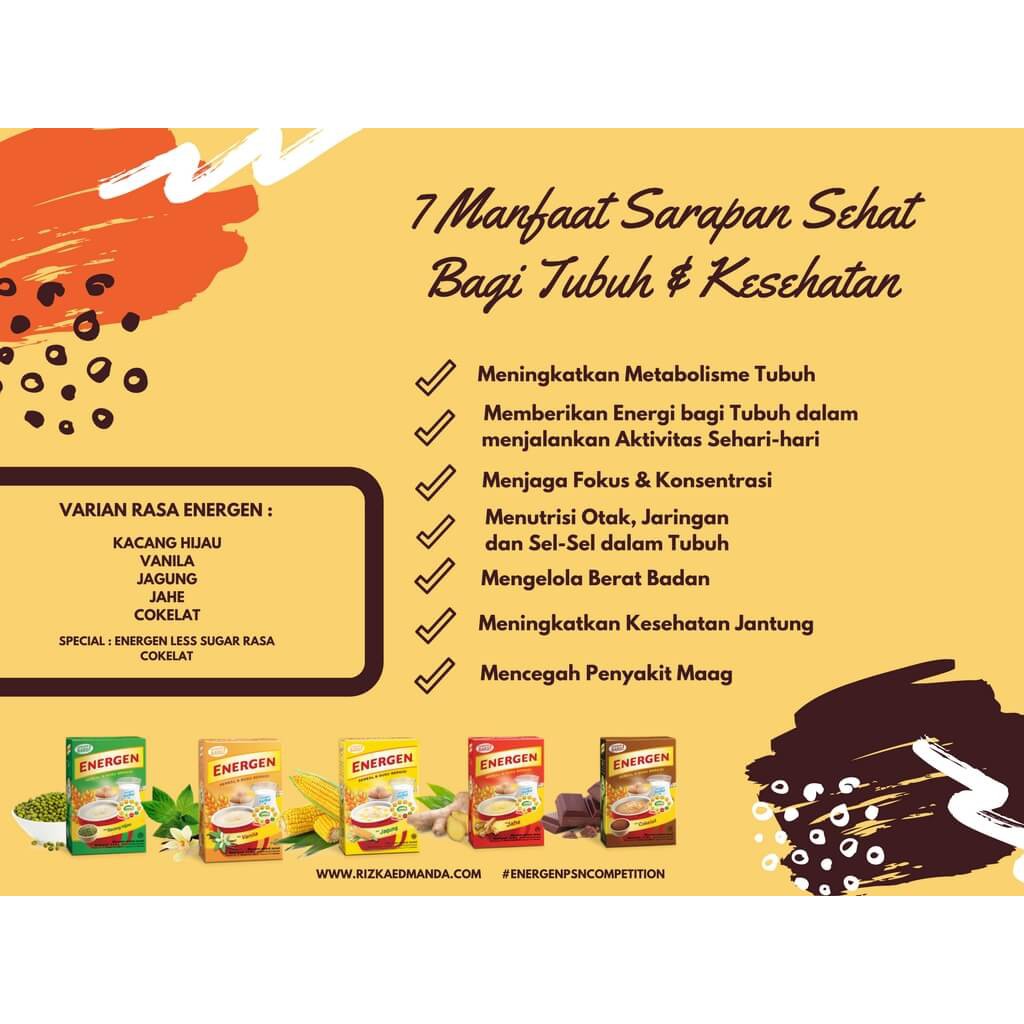 Tidak sempat membuat sari kacang ijo sendiri? Energen memiliki beberapa varian rasa yaitu rasa coklat, rasa vanilla, rasa kacang hijau, rasa jahe, dan jagung. Manfaat energen jagung tidak hanya sangat enak sebagai sarapan kandungan nutrisi yang ada didalamnya membuat menu sarapan sangat sehat.